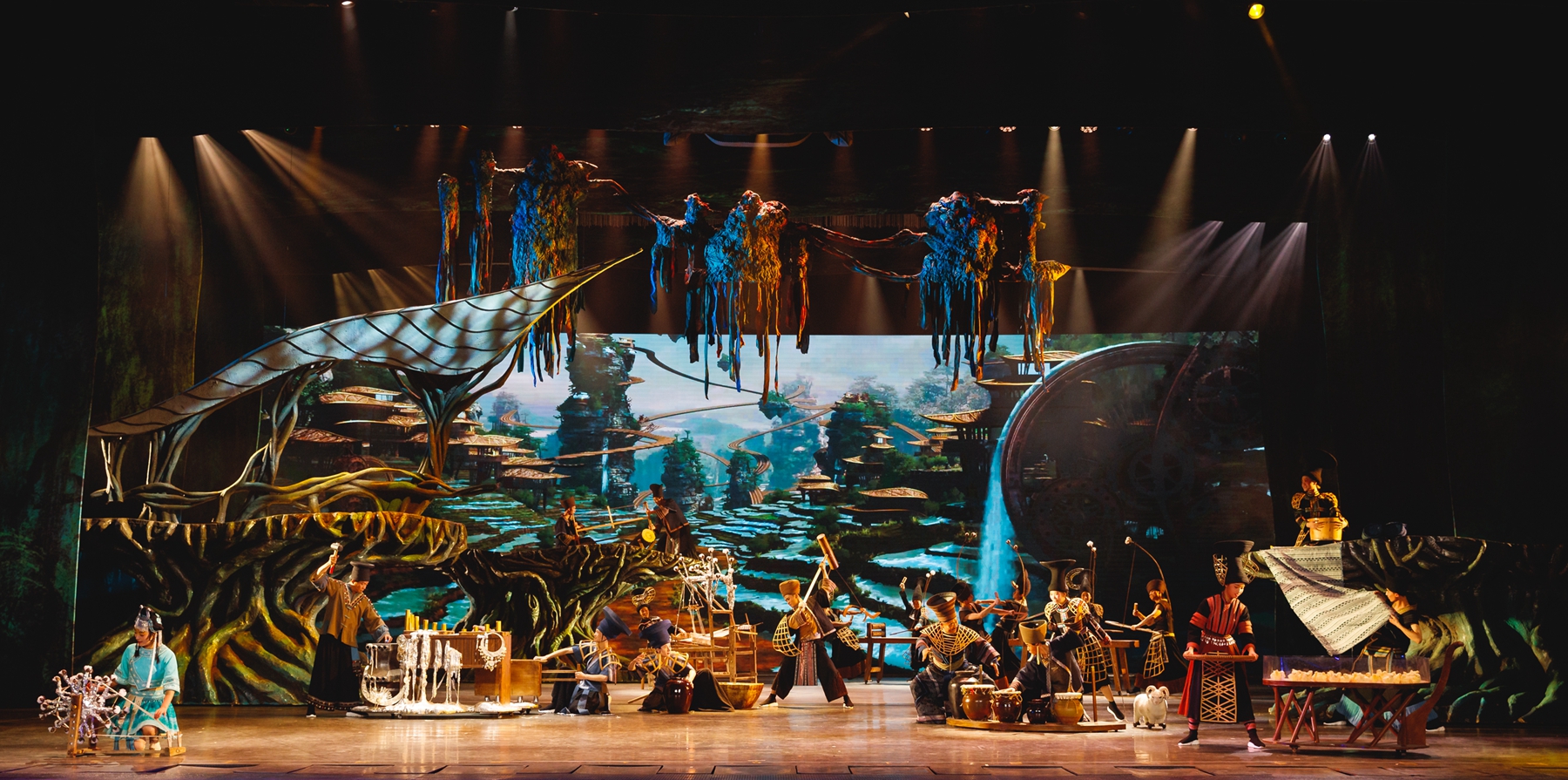 清晨,張家界大山中的古老山寨在雞鳴犬吠聲中蘇醒,山民們?cè)诔筷乩锩β灯鸶髯缘臓I生。于是缸、罐、盆、碗變成了樂器,彈棉花、篩米、紡紗、鋸木合奏成了優(yōu)美的旋律,苗族水腔、土家族打溜子等非物質(zhì)文化遺產(chǎn)依次呈現(xiàn)……